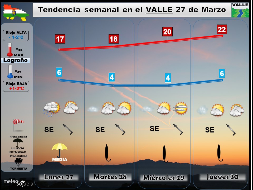 TENDENCIA SEMANAL Tu tiempo en Logroño y La Rioja. 27/03/2017 Aunque comenzará la semana con tiempo revuelto, con nubosidad y precipitación, la tendencia es a ir mejorando con menos nubes, más sol y ascenso de temperaturas. El fin de semana empeoraría de nuevo. Por lo tanto ambiente variable y primaveral. ¿ COMO HA SIDO EL […]
