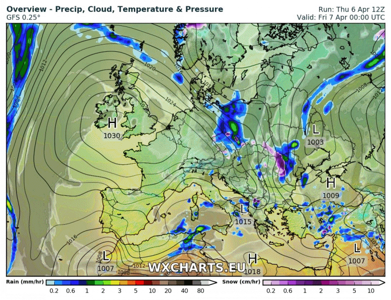 Vemos en la animación lo que venimos contando. Predominio de altas presiones, con ausencia de nubosidad y precipitación. Borrasca descolgándose por el Atlántico