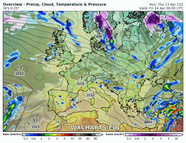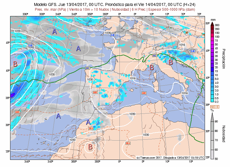 VIERNES 14 DE ABRIL : ALGO MAS INESTABLE. NUBES ALTAS Y DE EVOLUCION EN LA IBERICA. VIENTOS DEL NNW Y TEMPERATURAS UN POCO MAS BAJAS