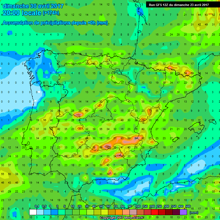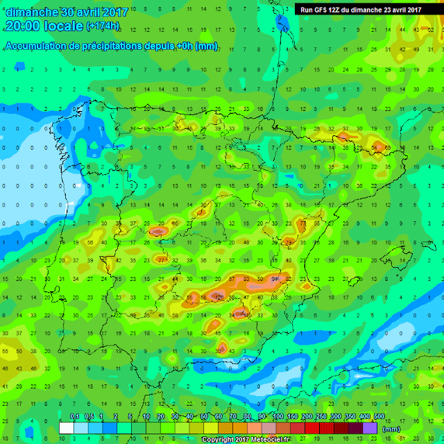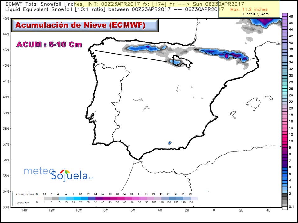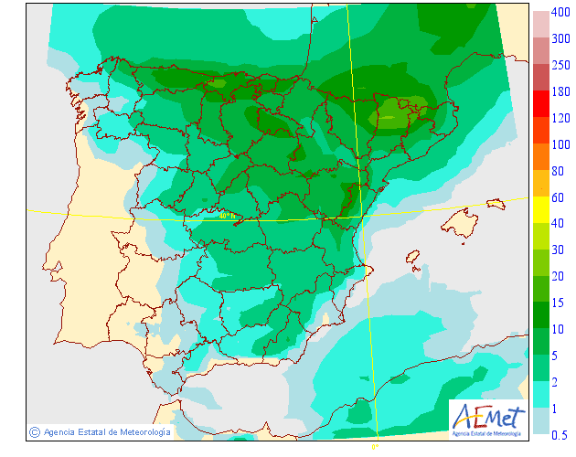 En los modelos globales de precipitación acumulada vemos , acumulados de entorno a los 5 litros en el valle y los 20-30l en la Ibérica. Precipitaciones asociadas al paso del frente y a a presencia de alguna tormenta.