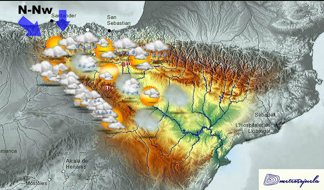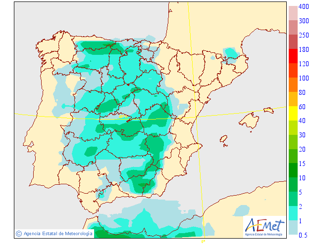 Se espera precipitaciónes, que localmente pueden ser intensas y persistentes, sobre todo en zonas de la Ibérica. Algunas de ellas pueden ser en forma de chubascos tormentosos.