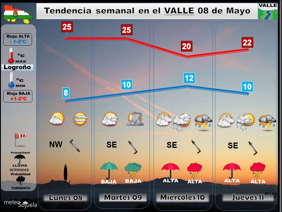 EVOLUCION SEMANAL Tu tiempo en Logroño y La Rioja. Comenzará la semana tranquila pero la llegada de una borrasca con aire frío en capas altas va a producir una inestabilización de la atmósfera con aumento de la nubosidad y aparición de tormentas que localmente pueden ser intensas y con granizo. A finales de semana irá […]
