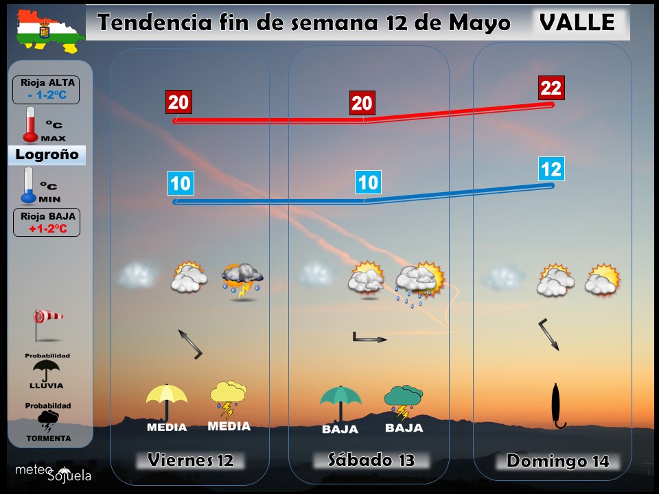 TENDENCIA DEL FIN DE SEMANA El tiempo en Logroño y La Rioja. Sin llegar a desaparecer del todo la inestabilidad, la tendencia es a mejorar. El viernes todavía será un día inestable y revuelto con riesgo de tormentas. Sábado mejorando con alguna nube más por la tarde, y domingo de nubes y claros con temperaturas […]