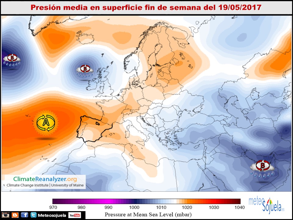 Observamos en superficie , como poco a poco las altas presiones dominan el panorama. El viernes el anticiclón de las Azores favorece la llegada de vientos del Nw, más frescos. El sábado las altas presiones se situan sobre la península despareciendo el cierzo y el domingo vientos del SE, más cálidos y siguen predominando las altas presiones