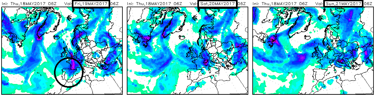 Fijaos , el viernes, los vientos del Nw acumulan nubosidad en el norte, por lo que tendremos algo de nubosidad retenida, el sábado predominio de altas presiones con temperaturas más altas y el domingo aparece una baja en el Sw de la península que aparte de favorecer la llegada de vientos del Sur también aportará nubosidad de tipo medio-alto incluso con nubes de evolución en zonas de montaña.