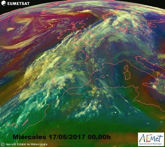 Abundante nubosidad de tipo medio-alto ya nos indicaban de que se acercaban cambios y es que lo dice el refrán….”Cielo empedrado…suelo mojado”….y todo debido a la entrada de esa vaguada de aire frío en capas altas que generaba acusada inestabilidad y frentes, como así de bien se ve en las imágenes del Satélite Meteosat…(colores morados)
