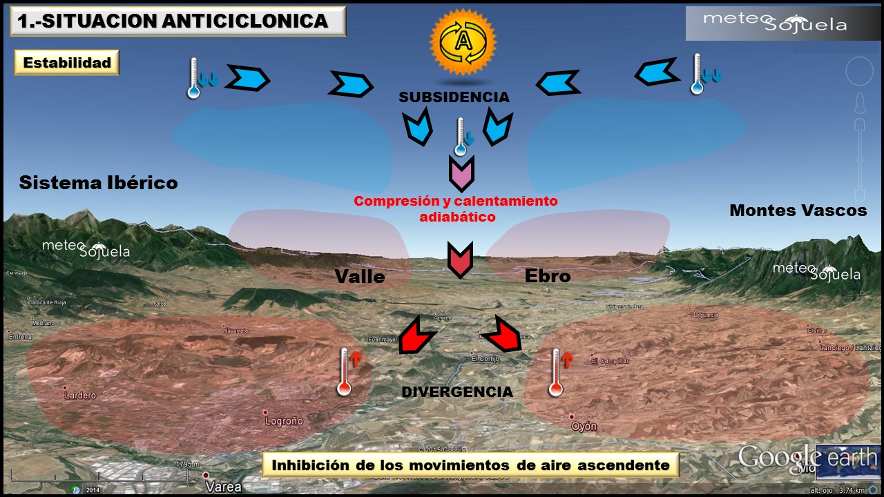 Por lo tanto y con las altas presiones dominantes solo tenemos que recordar lo que ocurre dentro de un anticiclón..