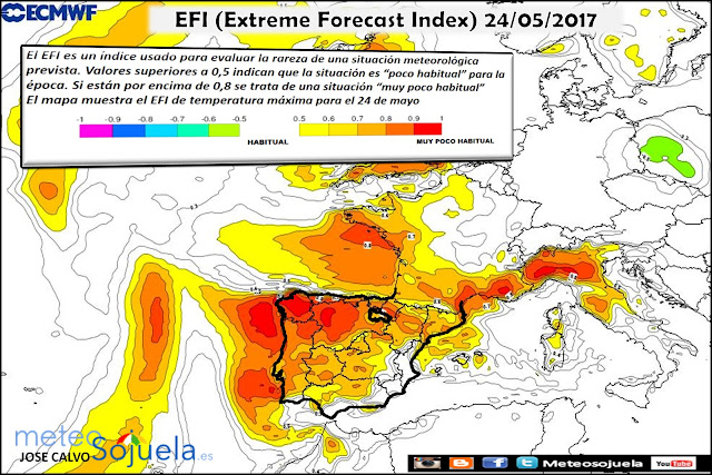 Y esto…¿ es normal ?…pues en los tiempos que corren en los que todo lo medimos para responder esta pregunta recurrimos al EFI (Extreme Forecast Index O Indice de Predicción de Extremos), este índice utilizado por el Centro de Predicción Europeo valora la rareza o singularidad respecto a una variable en superficie como puedan ser temperaturas, lluvias, vientos..etc