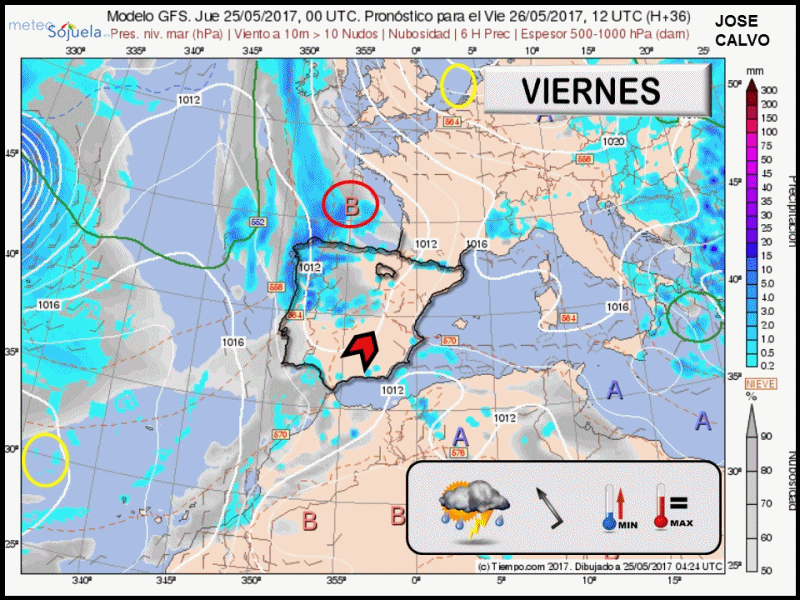 VIERNES 26 DE MAYO : AUMENTA LA INESTABILIDAD. INTERVALOS DE NUBES MEDIAS-ALTAS Y CLAROS. NUBOSIDAD DE EVOLUCION QUE DEJARA TORMENTAS . VIENTOS DEL SSE Y TEMPERATURAS CON POCOS CAMBIOS. CALOR.