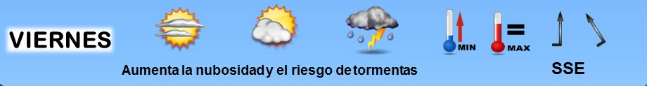 SABADO 27 DE MAYO: SIMILAR. INTERVALOS DE NUBES MEDIAS-ALTAS Y CLAROS, CON NUBES DE EVOLUCION POR LA TARDE QUE PUEDEN DEJAR ALGUNA TORMENTA AISLADA. VIENTOS DEL SSE Y TEMPERATURAS UN POCO MAS BAJAS.
