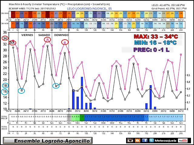 En los Ensembles del aeropuerto de Agoncillo donde se exponen la tendencia de temperaturas y precipitación, y que podemos hacer extensible a la zona de Logroño, observamos como las temperaturas tanto máximas como mínimas se mantienen en valores insualmente altos; las precipitaciones, aparecerían la semana que viene aunque no se descartan algunas tormentas.