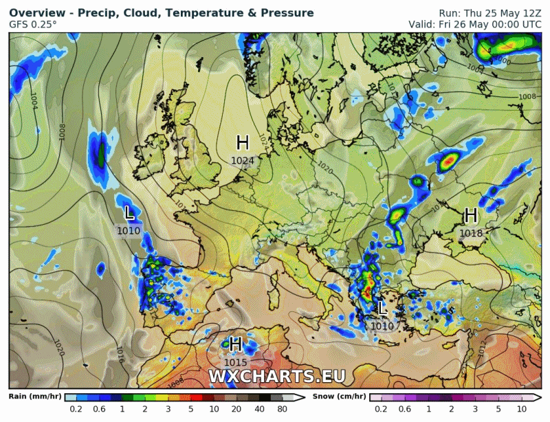 En la animación cada 6 horas de Wxcharts, vemos lo que vamos comentando. Fijaos , como diversas líneas de inestabilidad y frentes nos afectarán a lo largo del fin de semana. Parecen más activos viernes y domingo dándonos el sábado una pequeña tregua.