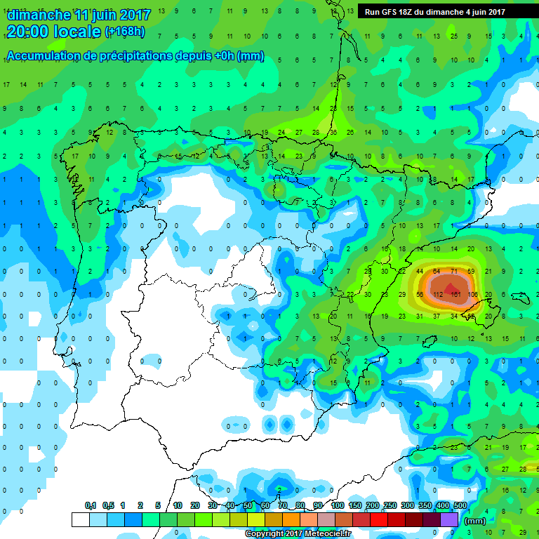 En los modelos globales de precipitación acumulada vemos , acumulados de entorno a los 3-5 litros en el valle y los 5/10litros en la Ibérica. Precipitaciones asociadas al paso de frentes y a la presencia de tormentas sobre todo de cara al jueves-viernes. Recordad que es un modelo global y que los chubascos tormentosos dejan precipitaciones de intensidad y distribucion