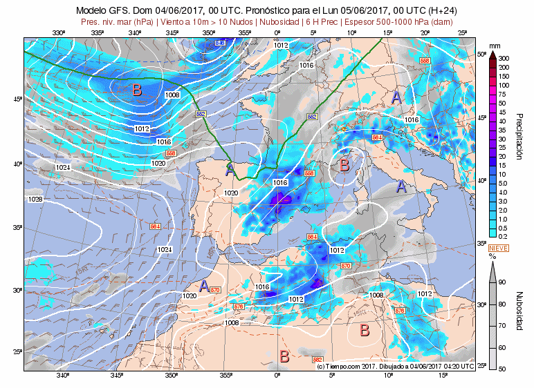 MARTES 06 DE JUNIO: EMPEORA. CIELOS NUBOSOS CON PRECIPITACIONES. VIENTOS DEL NW Y DESCENSO DE TEMPERATURAS. TENDENCIA A MEJORAR TRAS EL PASO DEL FRENTE