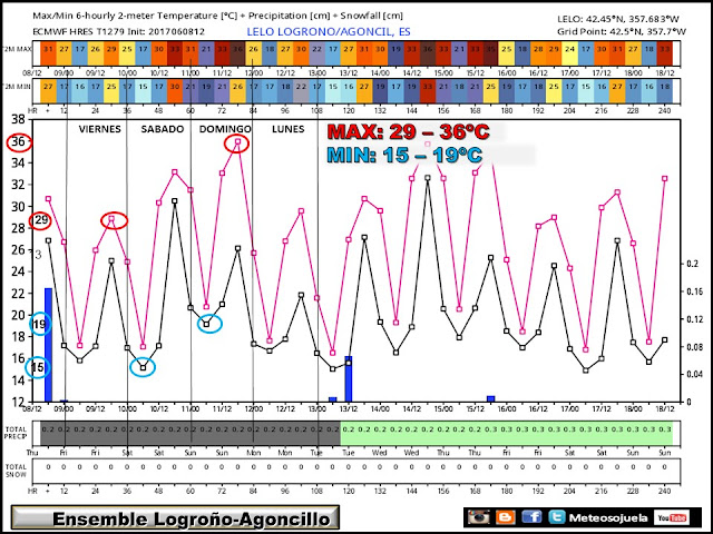 En el Ensemble del aeropuerto de Agoncillo que nos sirve para mirar la tendencia de la semana en nuestra ciudad, observamos esta semana lo dicho, como las temperaturas ascienden de forma progresiva, hasta el lunes que bajan. No se esperan precipitaciones