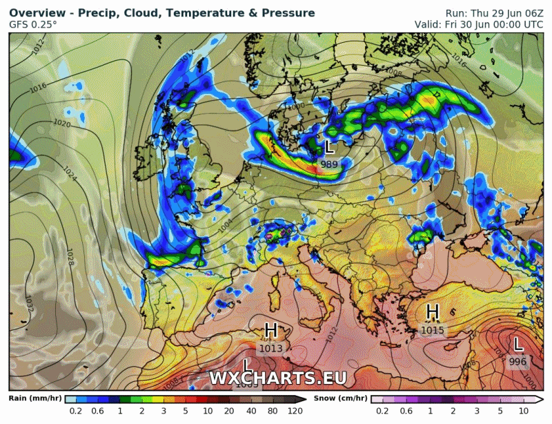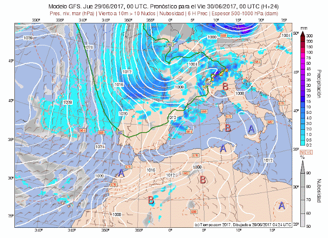 VIERNES 30 DE JUNIO : CONTINUA REVUELTO E INESTABLE. INTERVALOS DE NUBES Y CLAROS CON PRECIPITACIONES, ALGUNAS EN FORMA DE TORMENTA. CIERZO DE MODERADO A FUERTE Y TEMPERATURAS UN POCO MAS BAJAS