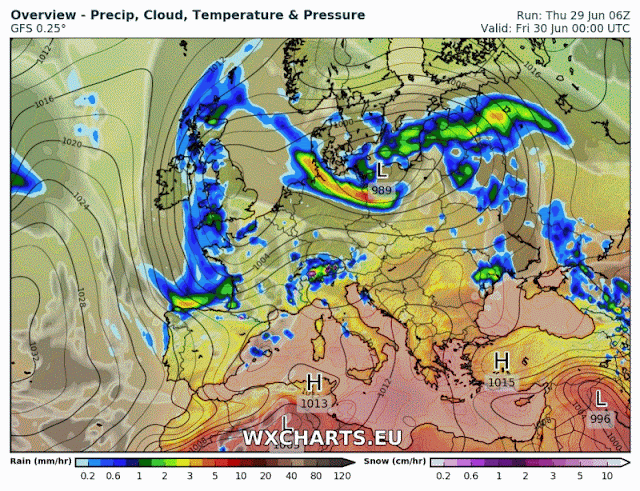 En la animación cada 6 horas de Wxcharts, vemos lo que vamos comentando. Fijaos que bien se ven las altas presiones (H) en el Atlántico y las bajas presiones (L) en Europa.