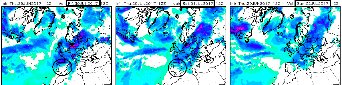 Vemos en la animación lo que venimos contando. Viernes y sábado con nubosidad abundante y algunas precipitaciones más probables cuanto más al oeste. Y el domingo el anticiclón se va acercando disminuyendo la nubosidad y remitiendo las precipitaciones