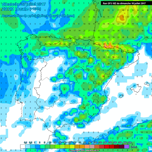 En los modelos globales de precipitación acumulada vemos , como suele ser habitual, mayores acumulados, de entorno a los 10-15 litros, en la Ibérica. Precipitaciones asociadas a la presencia de algunas tormentas . Recordad que es un modelo global y que los chubascos tormentosos dejan precipitaciones de intensidad y distribucion irregular.