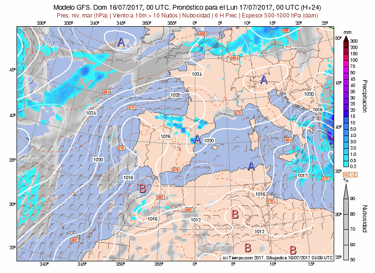 MARTES 18 DE JULIO: POCOS CAMBIOS. CIELOS POCO NUBOSO CON NUBES DE EVOLUCION POR LA TARDE Y POSIBILIDAD DE ALGUNA TORMENTA. VIENTOS DEL SW/SE Y TEMPERATURAS EN
