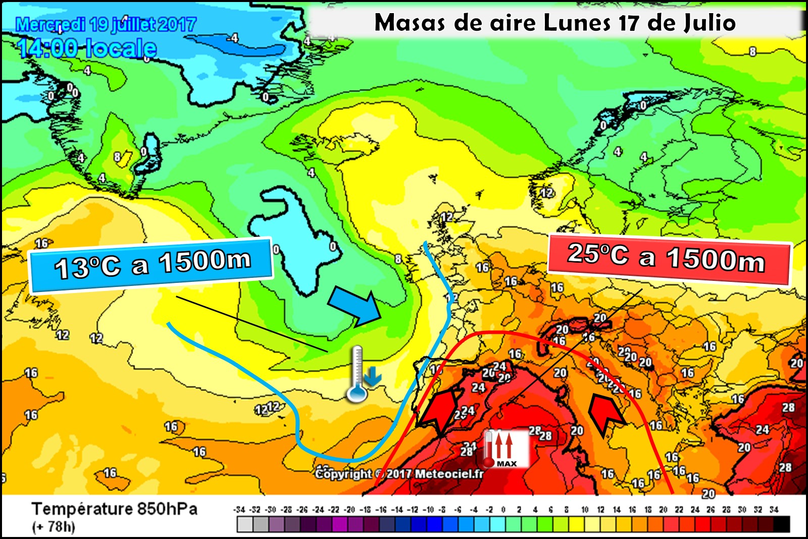 flechas el aire cálido, (colores más rojizos), en forma de cula que se aleja. Y en colores más claros (amarillo-anaranjados) el aire más frío que se acerca responsable del aumento de la inestabilidad.