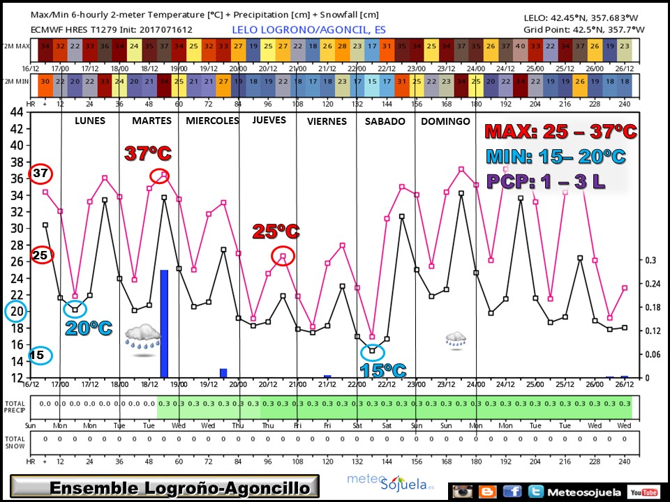 En el Ensemble del aeropuerto de Agoncillo que nos sirve para mirar la tendencia de la semana en nuestra ciudad, observamos esta semana , como las temperaturas muy altas al principio, descienden después, consecuencia de la entrada algunos días de vientos del Nw, refrescando entonces el ambiente. Se recuperarían durante el fin de semana. En cuanto a las precipitaciones, serían más significativas el martes, seguramente asociadas a la aparición de algunas tormentas.