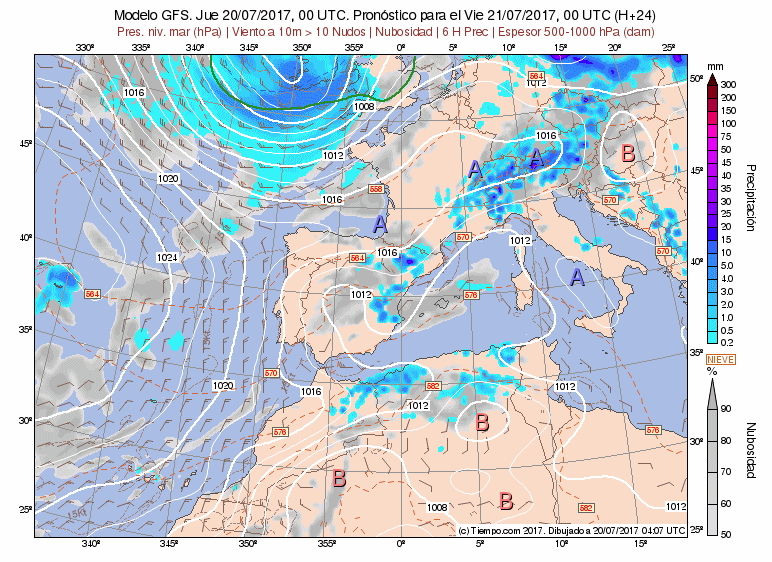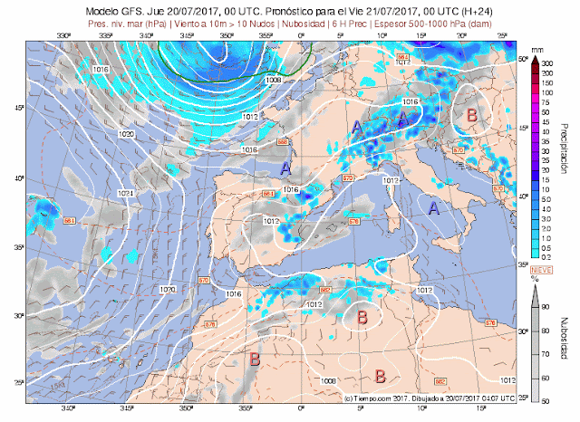 El anticiclón de las Azores, algo alejado de la península favoreciendo en principio la llegada de vientos del Nw, aunque con tendencia a extenderse en forma de cuña , por lo que estos vientos irán perdiendo intensidad predominando el regimen de brisas térmicas.