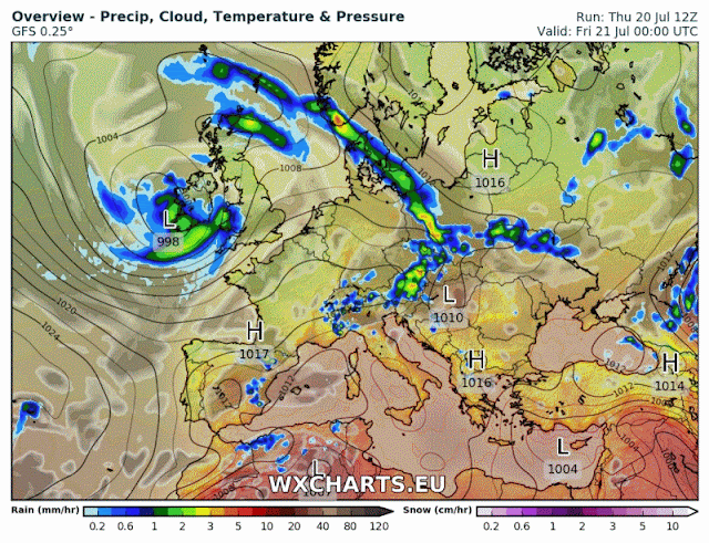 En la animación cada 6 horas de Wxcharts, vemos lo que vamos comentando. Profunda borrasca en el entorno de las Islas Británicas generando frentes que llegan debilitados a la península.