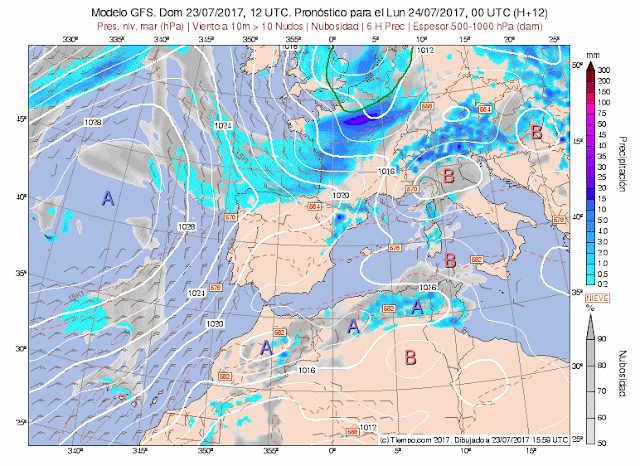 En esta posición de los centros de presión se favorece la llegada de vientos del NNW con tendencia a ir rolando al ESE conforme vaya disminuyendo el gradiente de presión y se vaya reactivando la baja relativa típica de la península en verano.