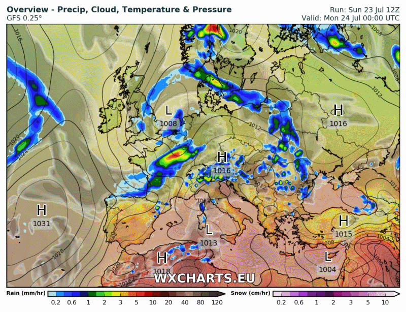 En la animación cada 6 horas de Wxcharts, vemos lo que vamos comentando. Anticiclón de las Azores favoreciendo los primeros días la llegada de vientos del Nw que empujan frentes, llegando debilitados a nuestra región. Vemos juntas las isobaras, así que esperamos que el Cierzo sople moderado. Poco a poco las altas presiones se irán estableciendo en la península, desapareciendo la nubosidad y ascendiendo las temperaturas. Consecuencia de todo ello se irá formando la típica baja relativa fruto del calor acumulado que favorecerá la llegada de vientos más cálidos del ESE y la posibilidad de formación de algunas tormentas por la tarde, sería esto sobre todo de cara al fin de semana.