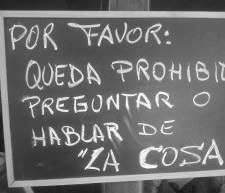 “Prohibido hablar de la cosa”. Me cuenta mi santo que vio en un bar un cartel en el venía esa frase y al preguntar a qué se refería, le contestaron que el comentario generalizado al pedir algo en la barra era “¡cómo está la cosa!” referido a la situación económica del país, en tono fatalista y más que de queja, de desesperación. Hartos de ello, los del bar, decidieron poner esa frase para ver si así conseguían levantar el ánimo de la clientela (y, de paso, estimular un poco el consumo).