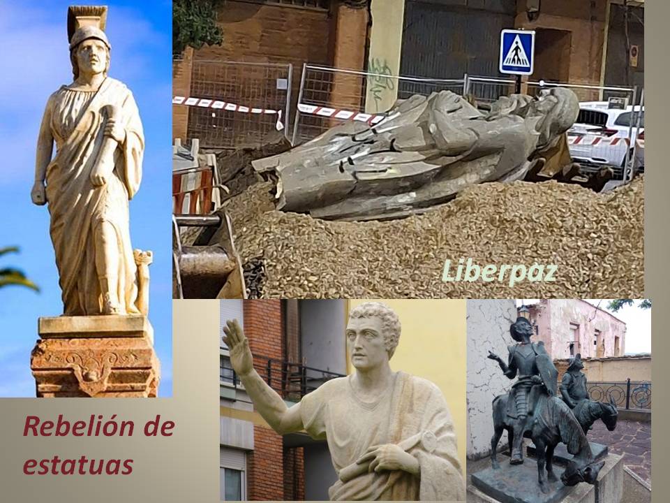 La Matrona les contó que Liberpaz estaba tan mutilada que creyó que agonizaba, no pudo tomar su mano pero sí vio que lloraba. Quintiliano, más joven que la Matrona, estaba enojado. Bajó su brazo alzado, tiró el pergamino y dijo: ¡No hay derecho, es un mal presagio que en la ciudad de los Mártires, hasta las estatuas podamos ser martirizadas! Del casco antiguo, en su rocín, llegó don Quijote y exclamó: ¡Qué locura y desatino es éste! ¿Cuál será la siguiente? ¡Algo habrá de hacerse! Sancho medió: ¡mi señor, lo primero, contarlo y que sepan todos cuantos quieran ver y entender que el maltrato hacia las estatuas es motivo de general enojo y de censura de los culpables! ¡Tome nota la autoridad!