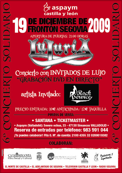 Acabo de llegar de Segovia y me encuentro frente al ordenador para contaros lo que ha sido un acontecimiento muy especial, el concierto solidario que nuestros queridos LUJURIA ofrecían ayer sábado en su ciudad natal junto a un buen puñado de amigos- WARCRY, TIERRA SANTA, CELTAS CORTOS -, a favor de la asociación ASPAYM de Valladolid, el cual fue registrado para su posterior edición en DVD, tal y como os contaba el pasado viernes en este mismo blog. Estoy algo cansado, espeso y con una resaca de órdago a la grande, chica, pares y juego…por lo que no me voy a extender demasiado, simplemente contaros a grosso modo lo que sentí en mis carnes hace unas pocas horas. Sí, lo sé…estoy viejuno.