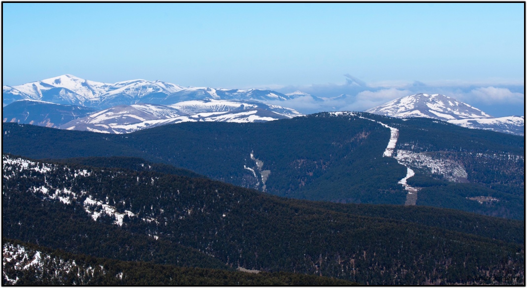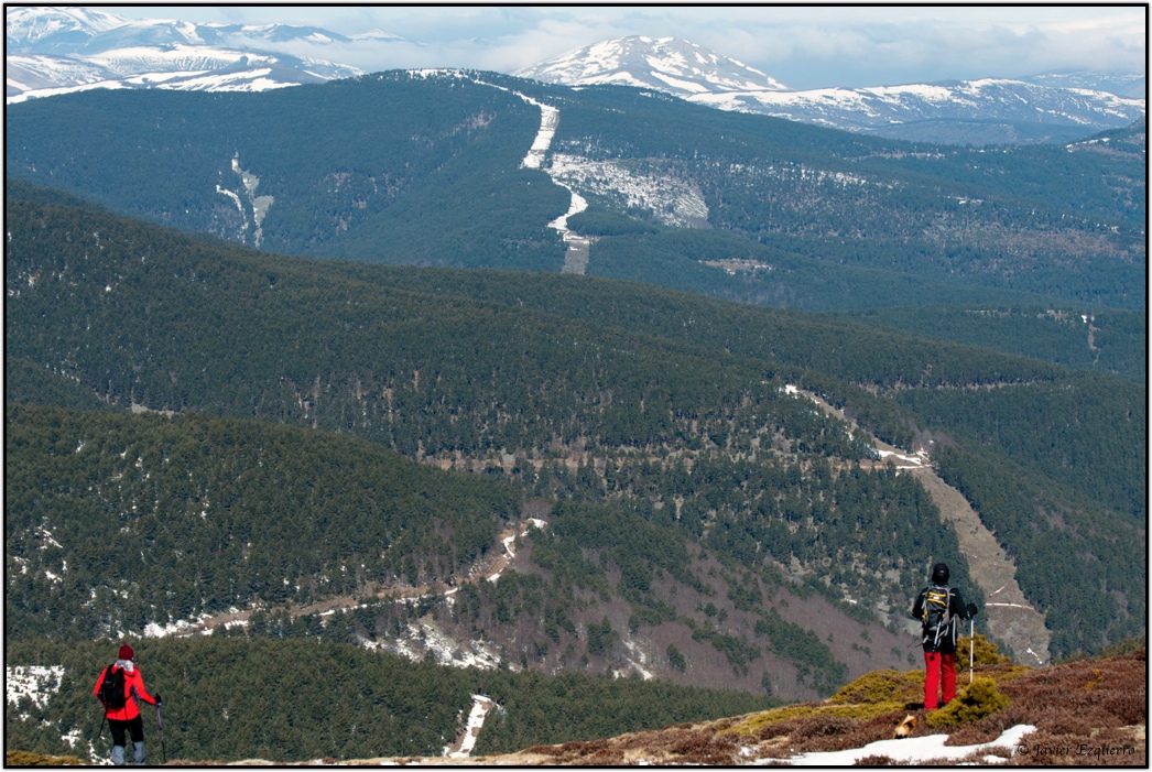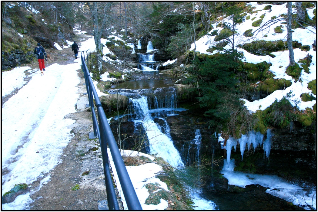 El momento ‘cumbre’ se aprovecha para almorzar (una lástima que no hubiera pan) y gozar de las panorámicas, que en este caso se extienden por toda la montaña riojana, sin excepción, cubierta todavía por abundantes retales de nieve en su mitad occidental. Ya hacia el sur, fuera de los límites provinciales riojanos, se divisa desde el Moncayo hasta Guadarrama y, más cerca, el embalse soriano de la Cuerda del Pozo, ese gran aljibe del río Duero. No hay mejor clase de geografía que encaramarse a uno de los grandes colosos de la península y ver lo que se extiende a tus piés. El descenso, mas sosegado, aunque fatigoso para las rodillas, lo hicimos por el mismo camino con la variante que improvisamos para coger el cortafuegos que baja vertiginoso desde la pista que lleva a Lomos de Orios hacia las cascadas de Puente Ra. Este salto de agua, que hace tan solo unas semanas permanecía helado, es otro de los grandes alicientes para visitar el parque de Cebollera. El domingo, el agua brotaba abundante en otro de los bellos espectáculos naturales que ofrecen los Cameros en esta época del año.