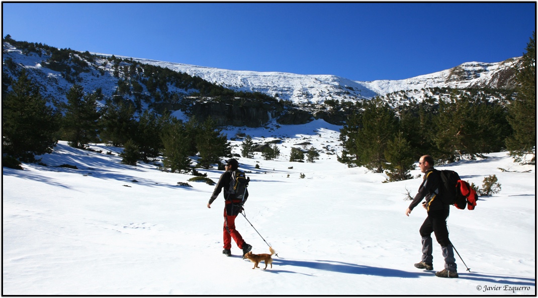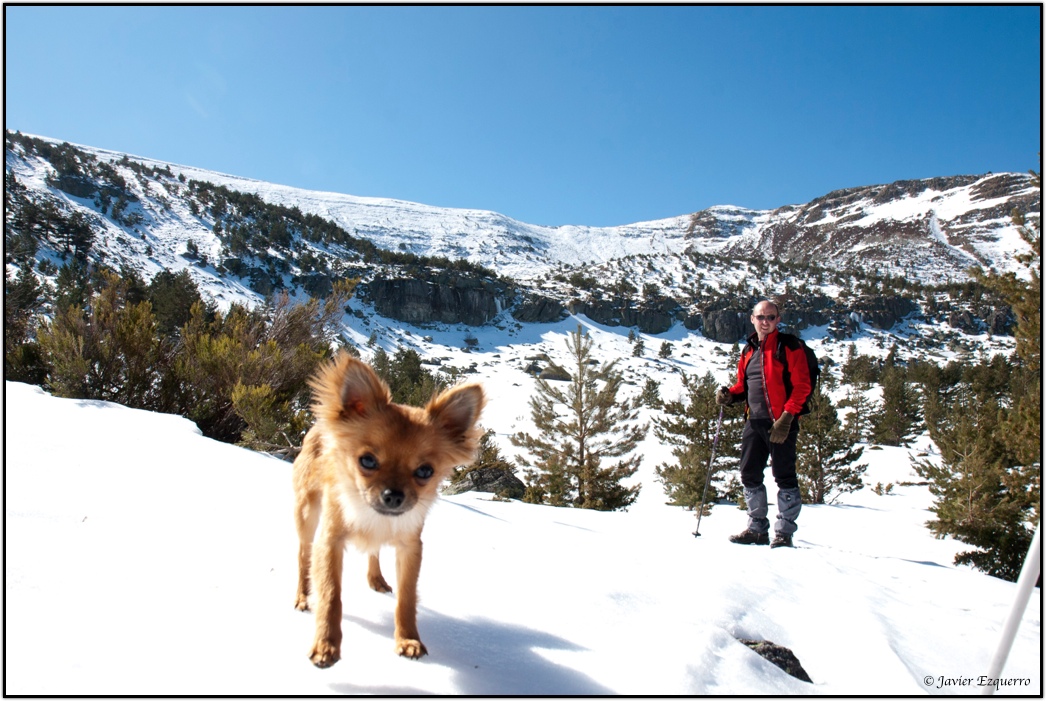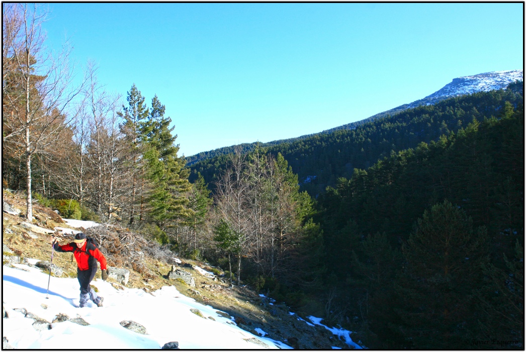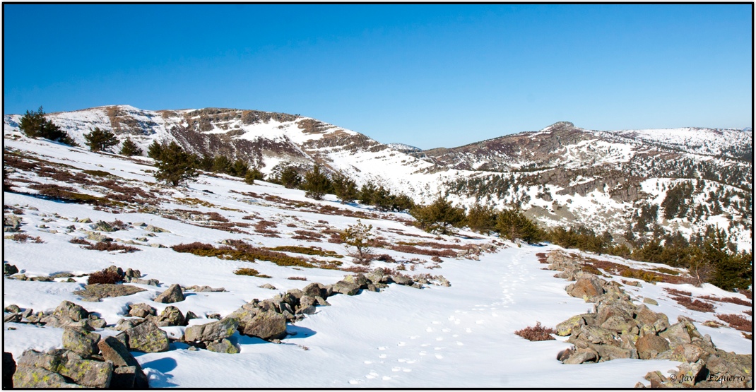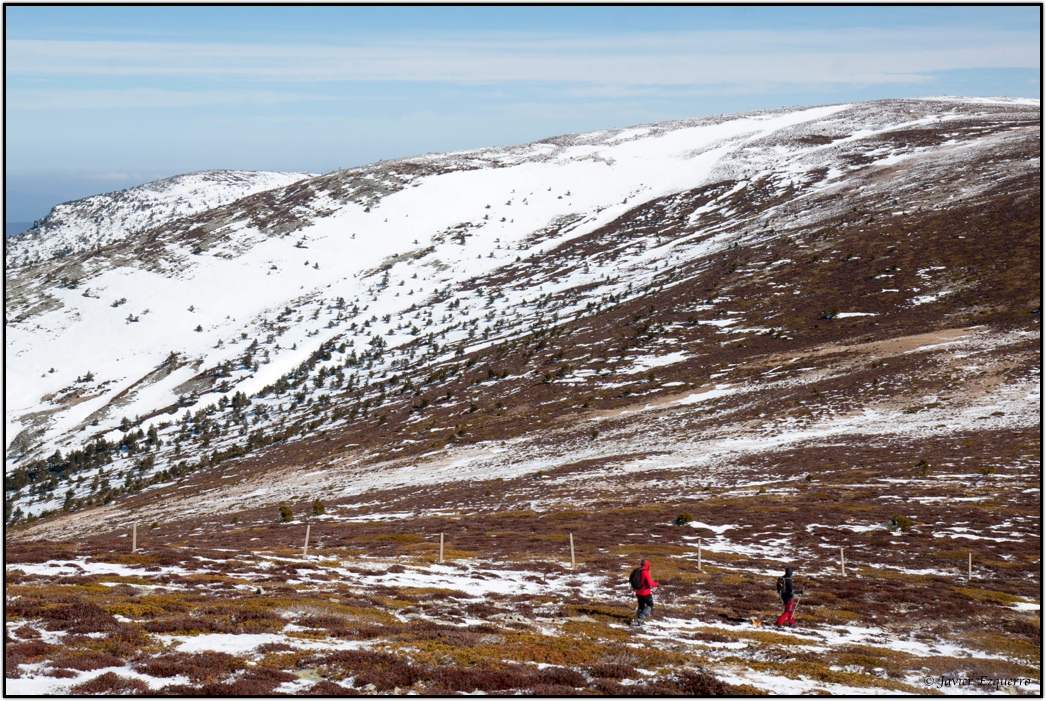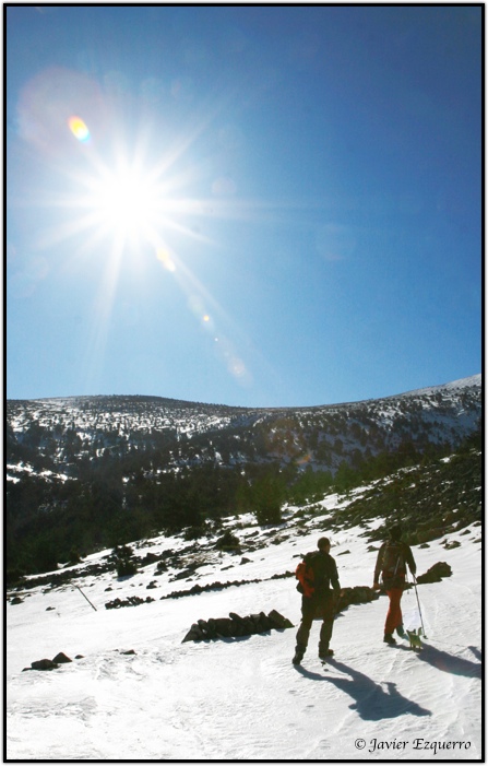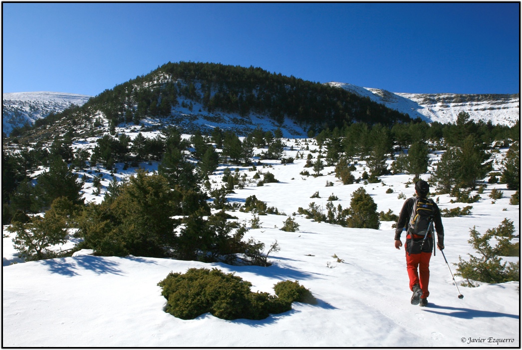 La belleza de la zona atrae a numerosos visitantes a lo largo del año, especialmente a partir de esta época, cuando el deshielo y los días más despejados permiten hacer incursiones por la red de senderos que surcan el parque. Para este cronista y los amigos David y Valentín (esta vez nos faltó José) el parque natural es uno de los grandes alicientes para nuestras escapadas de fin de semana. Este último domingo, elegimos la ascensión al Pico Cebollera desde el arroyo de Puente Ra, alentados por la imagen de las cumbres nevadas y unas favorables previsiones meteorológicas. Si lo hubiéramos pedido, el día no hubiera podido salir mejor para hacer una marcha matutina por este insuperable balcón sobre los Cameros. Tuvimos sol durante todo el trayecto, pero con la temperatura justa para no derretir la nieve helada, permitiéndonos de este modo una marcha fluida sin soportar la fatiga que conlleva caminar sobre la nieve blanda. La única incidencia se presentó al coronar la cumbre, con abundante hielo en el suelo y un viento huracanado que nos obligó a parapetarnos en el promontorio de piedras que soporta el hito cimero. Apenas si pudimos sacar un par de fotografías y algún gorro salió volando hacia los valles sorianos.