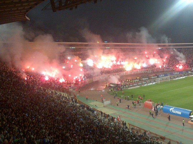 Si por algo se caracteriza un choque que pasa por ser el más caliente de Europa del Este, es justamente por ese inagotable despliegue de bombas, petardos, bengalas y cohetes que en nada tiene que envidiar al día grande de Las Fallas valencianas. Mientras que en Inglaterra las hinchadas revientan los decibelios del estadio entonando ‘a capella’ de manera solemne la canción-himno de su equipo, en Belgrado lo iluminan literalmente con un formidable zafarrancho multicolor de fuegos de artificio cuya procedencia es, sin duda, el gran misterio de esta batalla cíclica entre Delijes y Grobaris.