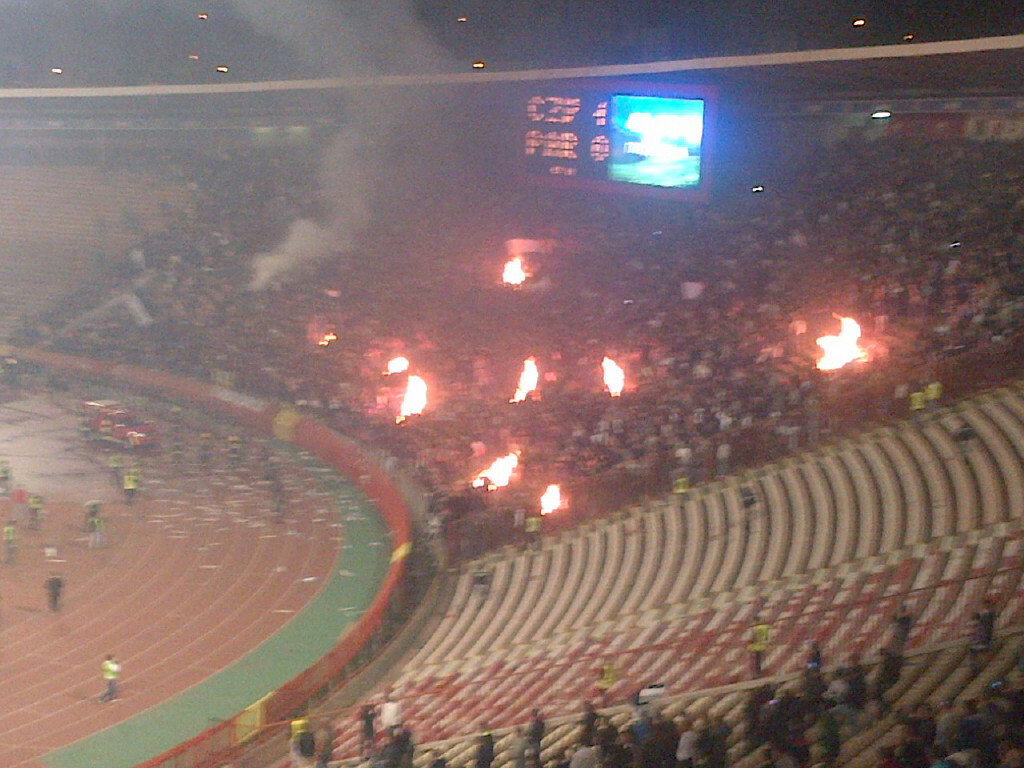 Aplacadas las llamas tras 20 minutos de lucha con el líquido elemento, los incondicionales del Estrella Roja dedican una ovación cerrada al equipo de bomberos, que repliegan líneas para tomarse un pequeño respiro, que será ya definitivo puesto que a esas alturas sendas hinchadas se han pulido ya el quintal métrico de material que colaron esa tarde en el Marakana balcánico.